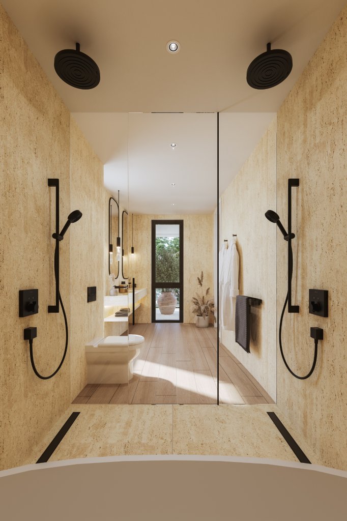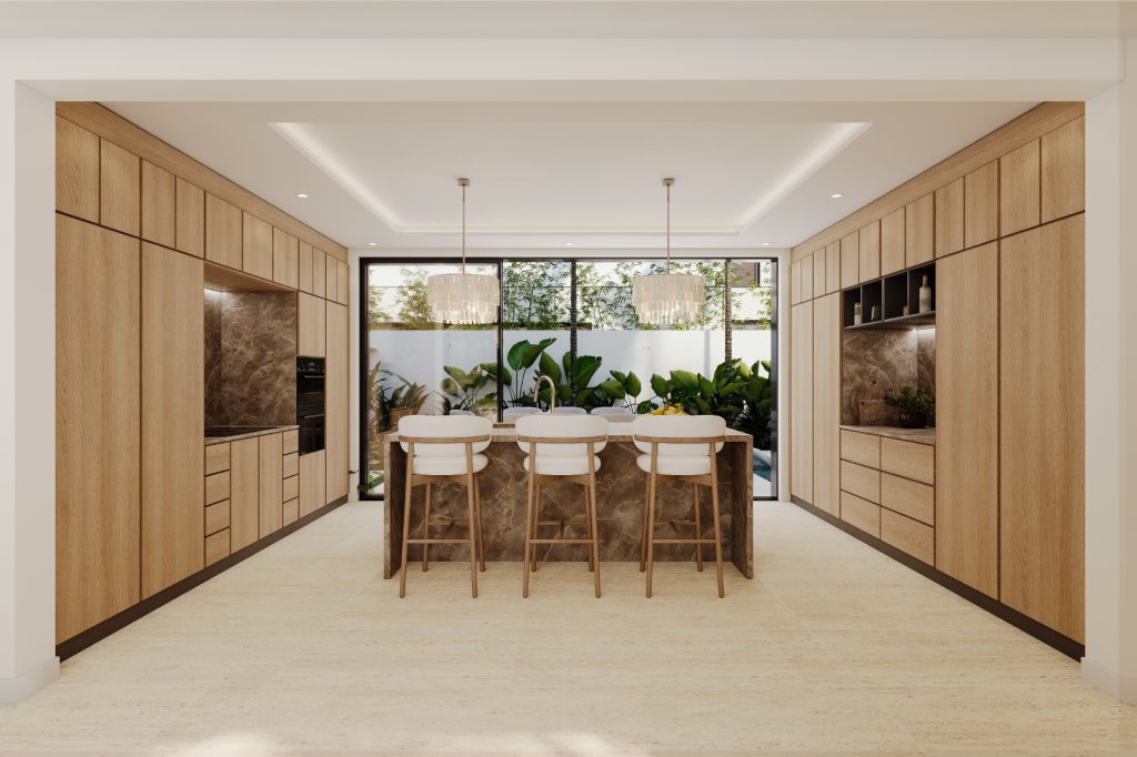 Inside, the villa boasts a state-of-the-art kitchen with high-end appliances and European cabinetry. Italian-designed closets add a touch of elegance to every room, while recessed lighting and ceiling fans create a comfortable ambiance. The second floor, accessible via a striking floating staircase, offers additional living space and breathtaking views.