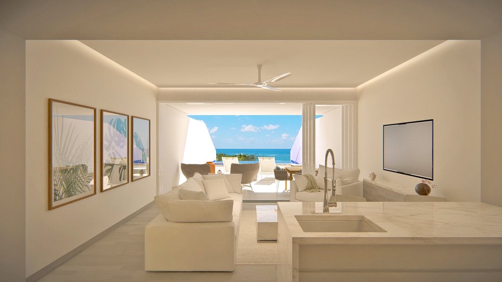 Spanning an impressive 1,685 sq. ft., each villa is meticulously crafted with an open-plan design that seamlessly integrates the charm of coastal living with contemporary elegance. The floor-to-ceiling sliding glass doors not only flood the interiors with natural light but also provide unobstructed panoramic vistas of the ocean, creating a seamless connection between the indoor and outdoor spaces.
