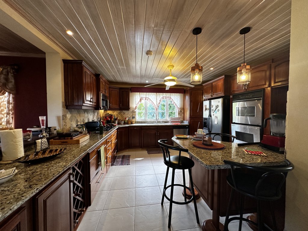 The spacious kitchen is a chef's delight, featuring imported redwood cabinetry, sleek granite countertops, and modern lighting. Brand-new stainless-steel double door refrigerator and built-in double oven, a nearly-new countertop stove, and a stainless-steel dishwasher complete this culinary haven.