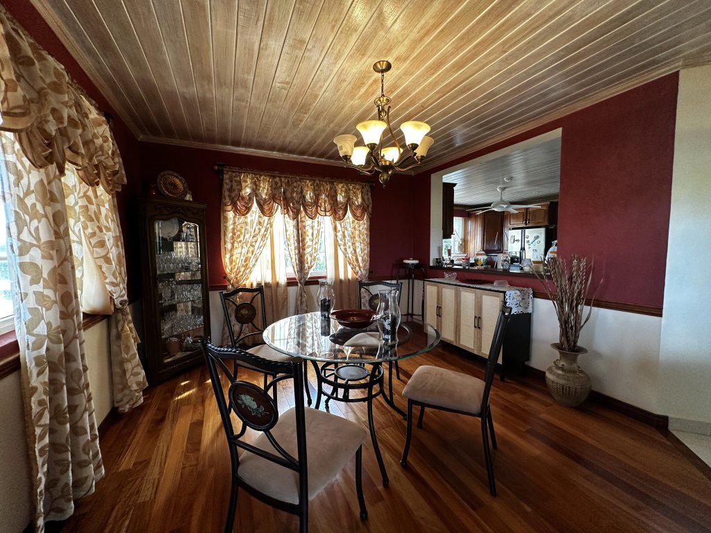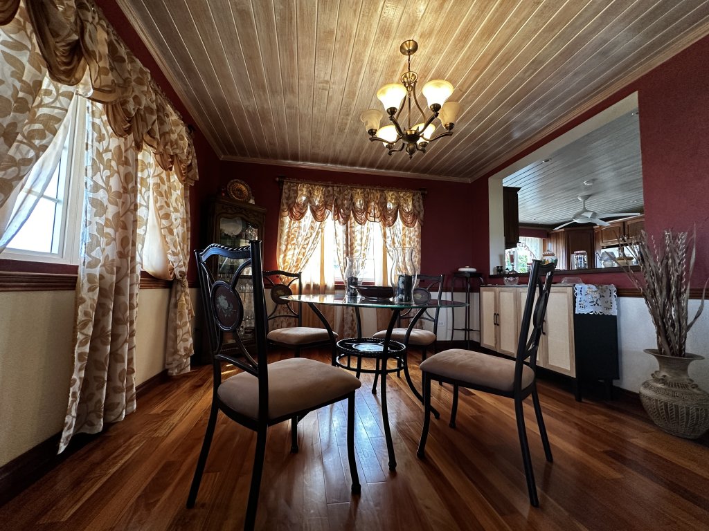 Step inside and be captivated by the inviting entrance foyer, overlooking a sunken living and dining room, both seamlessly flowing onto an ocean-facing patio. The living room's soaring teak ceilings create an airy, expansive feel, while the glass patio doors bathe the space in natural light and gentle sea breezes. The adjacent formal dining room, adorned with rich teak accents on the flooring and ceiling, exudes an atmosphere of elegance and sophistication.