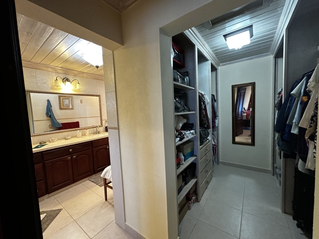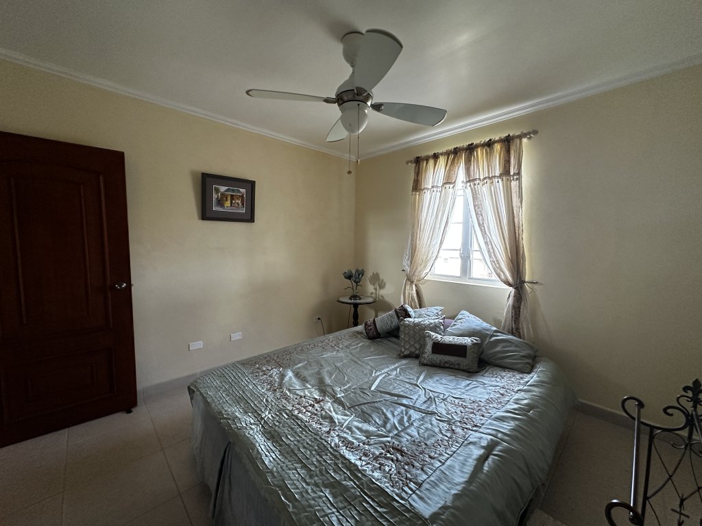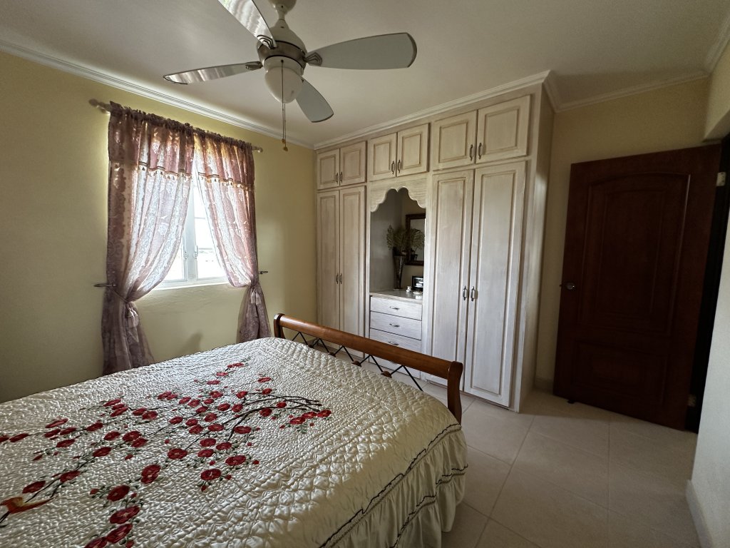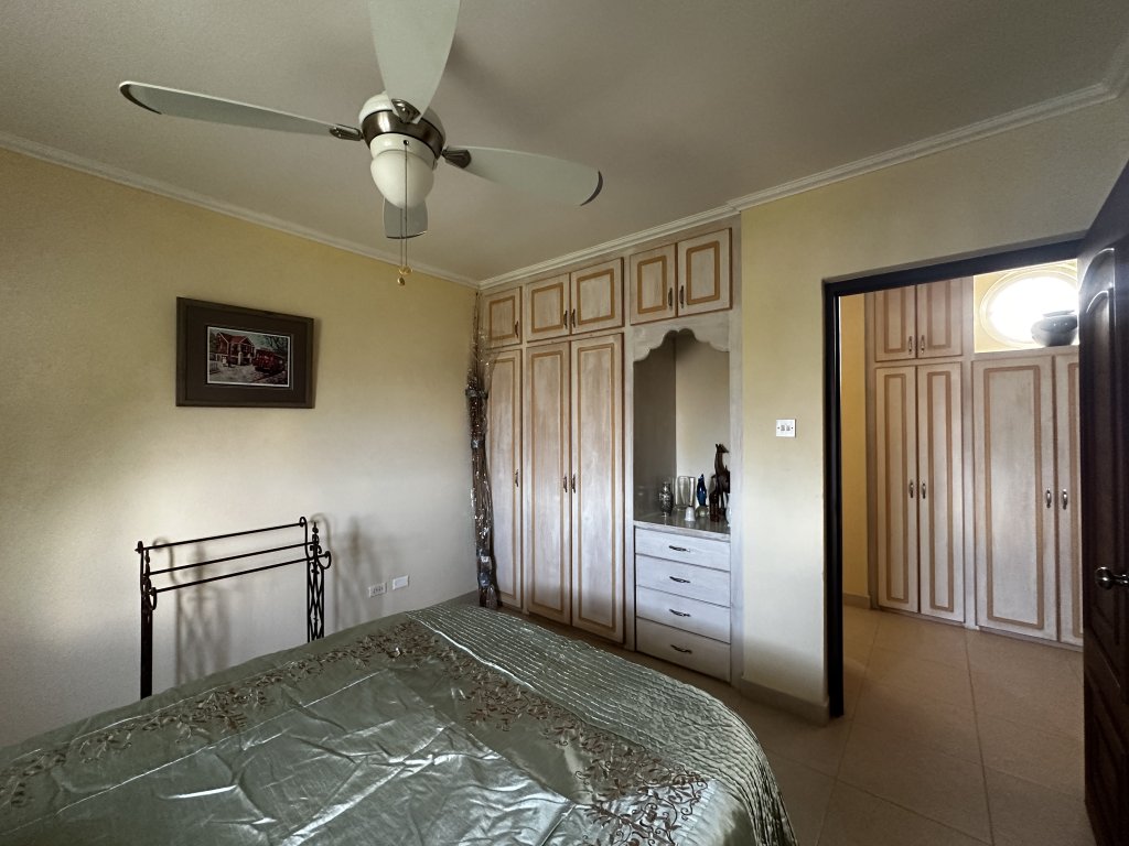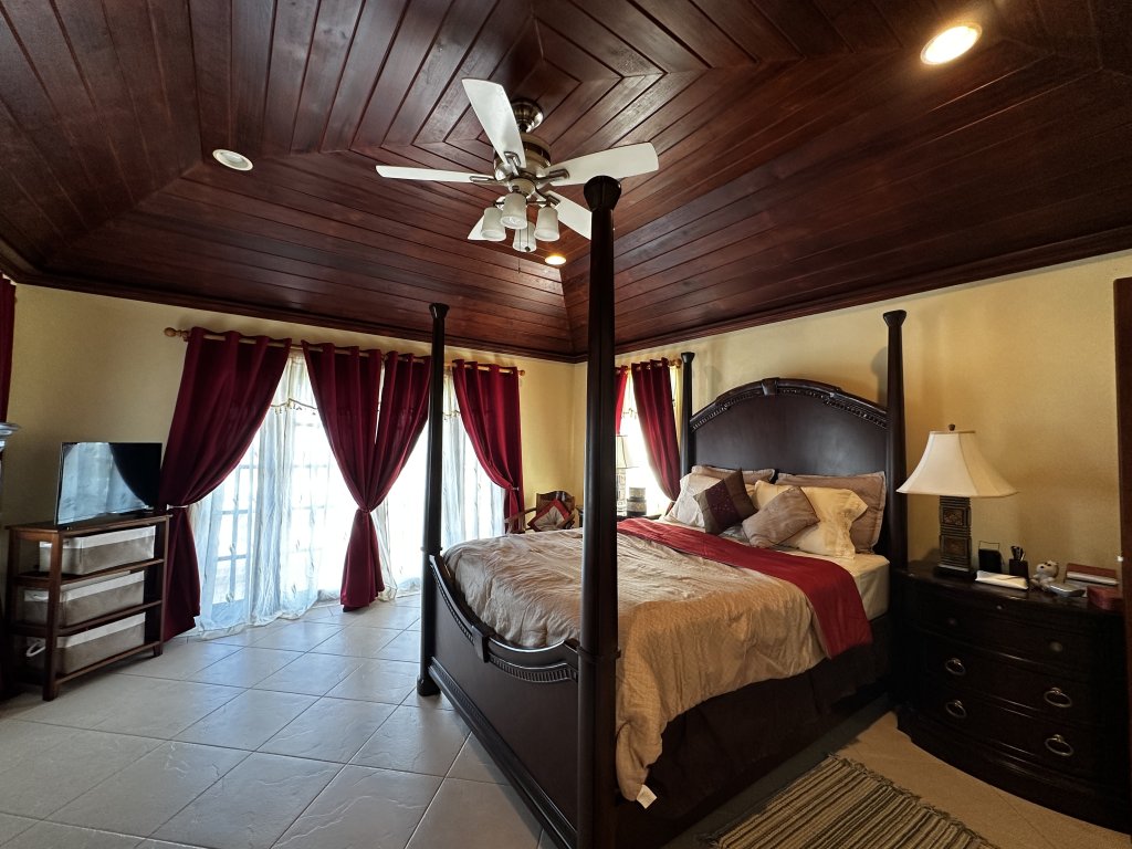 Two generously sized bedrooms share a well-appointed bathroom on the middle level. Both rooms offer ample space, ceiling fans, and built-in teak closets, complemented by additional storage on this floor.