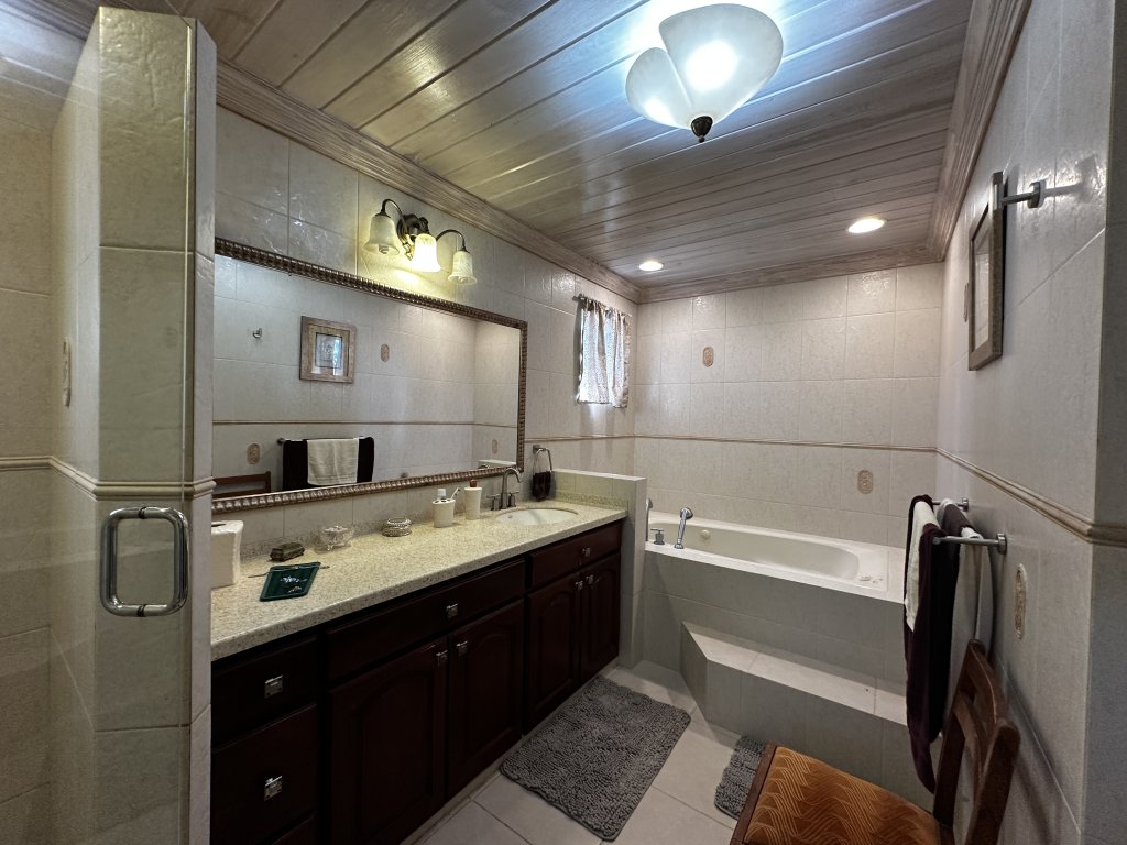 The luxurious primary bathroom is a sanctuary of indulgence, featuring a glass-enclosed rain shower, a separate jacuzzi tub, a generous vanity with ample storage, and elegant floor-to-ceiling porcelain tiles. The teak ceiling with downlighting adds a touch of warmth and sophistication.