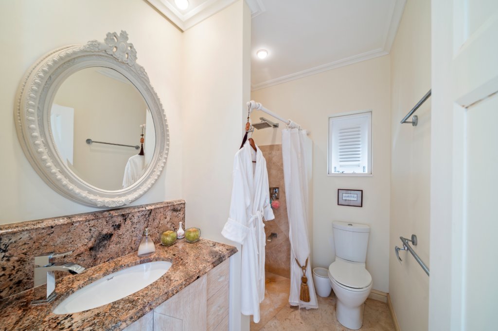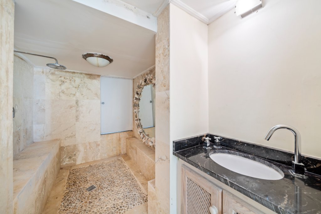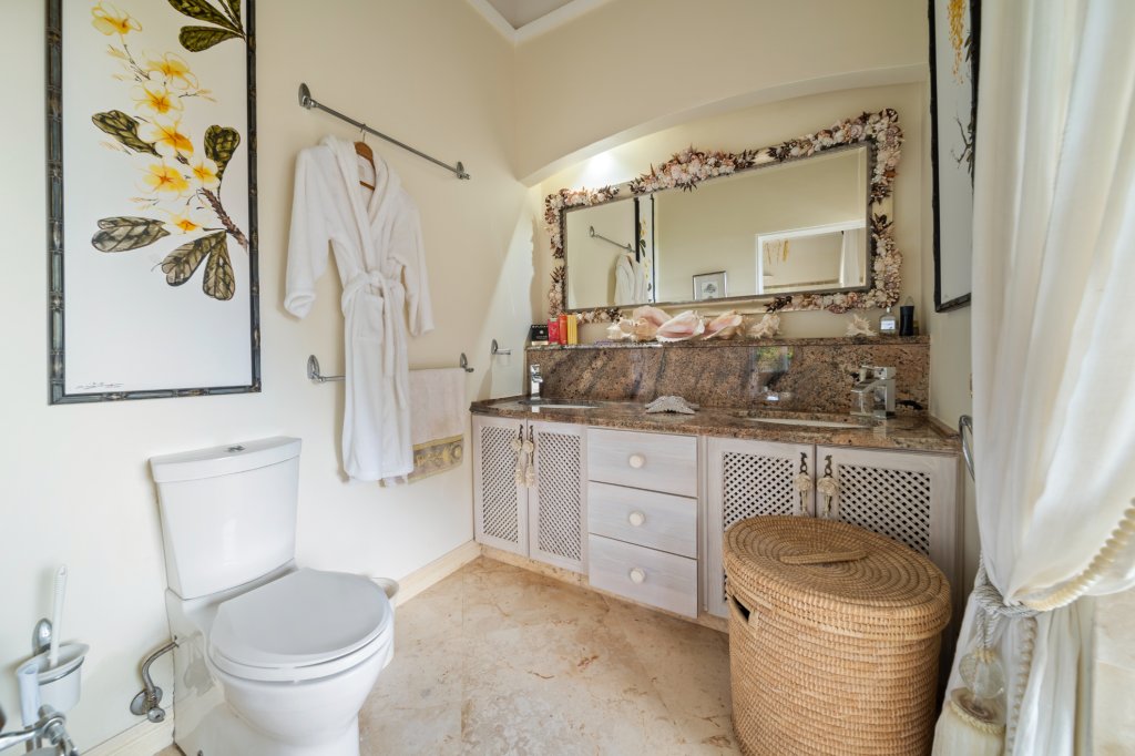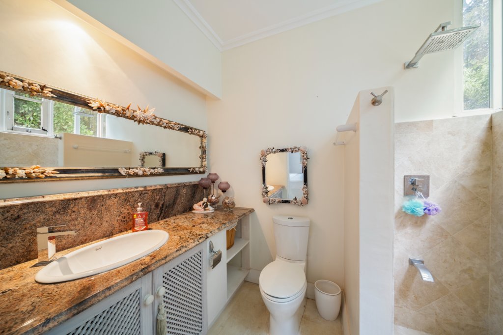 As you arrive at "In The Trees," you are greeted by a tranquil ambiance framed by mature trees and vibrant tropical flora. This exceptional residence provides an idyllic escape, perfect for those seeking serenity without compromising on luxury. The expansive design features five generously sized air-conditioned bedrooms, each accompanied by its own ensuite bathroom, ensuring comfort and privacy for residents and guests alike. An additional powder room adds convenience for entertaining.