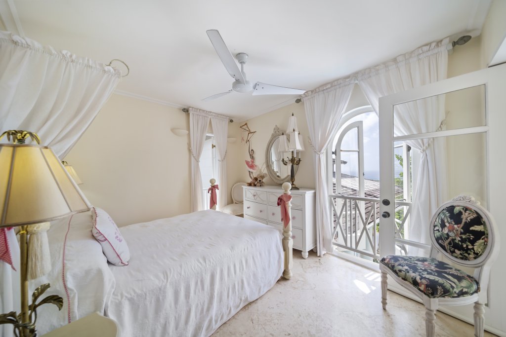 The well-appointed kitchen flows effortlessly onto the dining patio, creating an inviting atmosphere for entertaining family and friends while soaking in the captivating sea vistas. The thoughtfully designed layout ensures that three of the five bedrooms are conveniently located on the lower level, easily accessed via a gallery from the living area. An ornate staircase leads to the upper level, where the master bedroom and an additional ensuite bedroom await, both featuring captivating views.