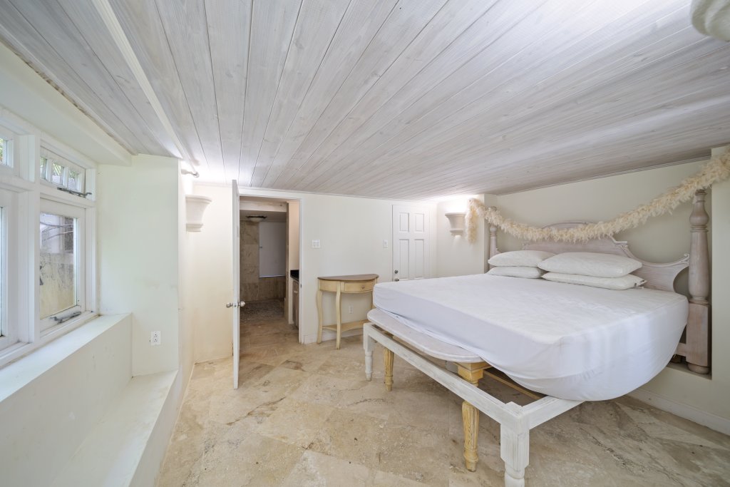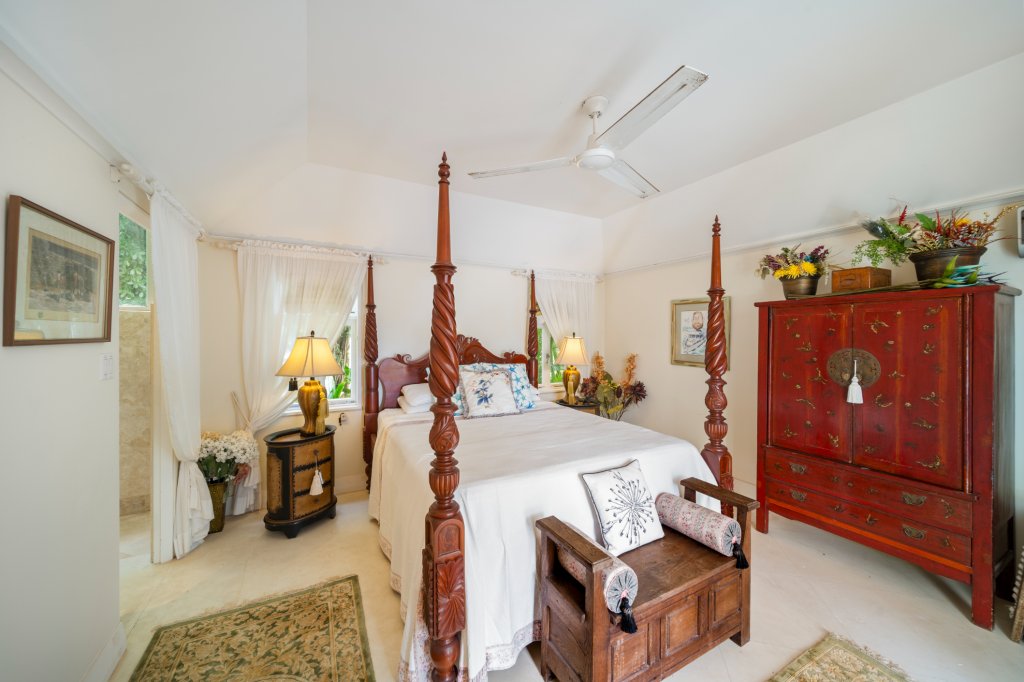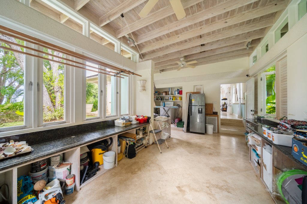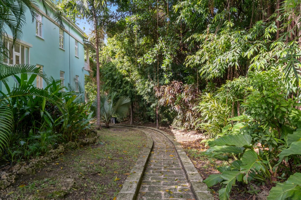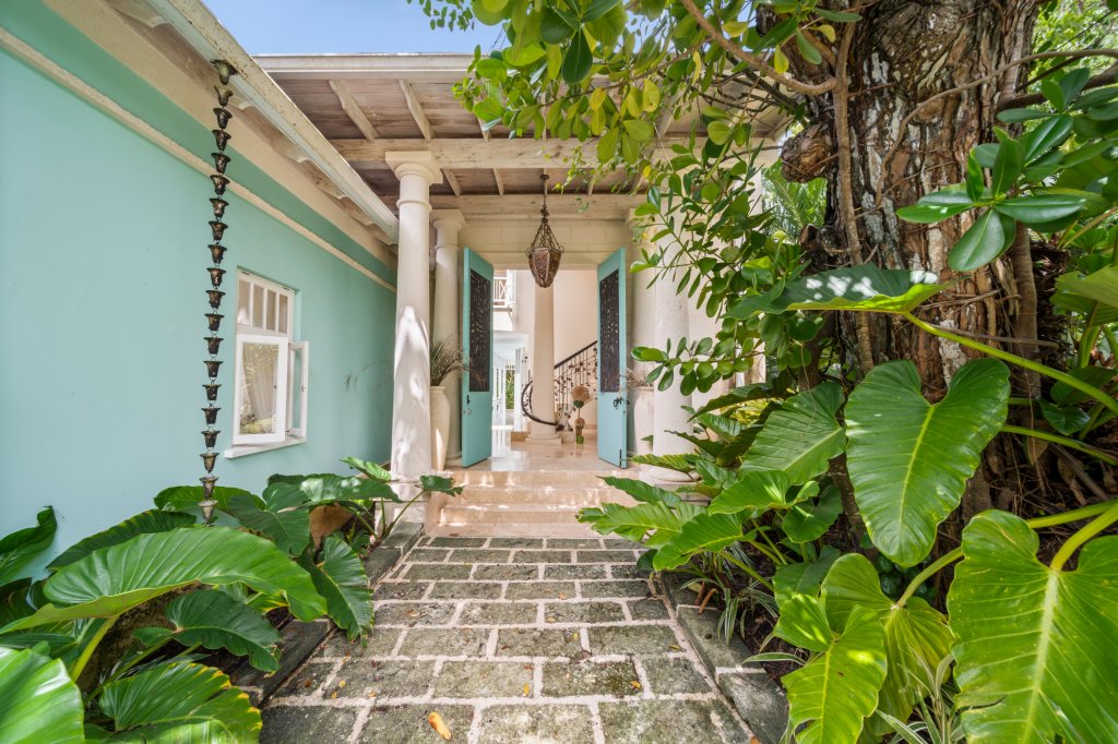 "In The Trees" is secured by wrought iron automatic gates, providing peace of mind and privacy. The expansive circular parking area accommodates multiple vehicles comfortably. Surrounding gardens showcase a rich variety of plants, palm trees, and foliage, enhancing the villa's secluded and tranquil atmosphere. Despite this serene setting, the villa is ideally located just a 10-minute drive from the exquisite beaches of Mullins Bay and the vibrant amenities of Holetown.