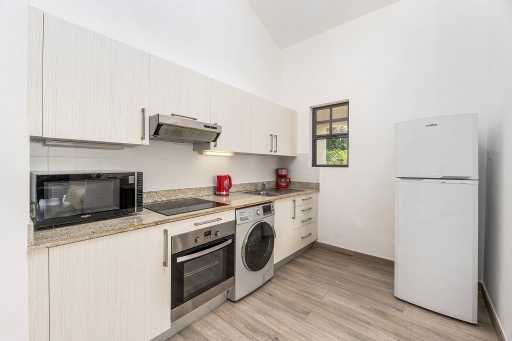 Step inside this beautifully designed home and immediately feel the welcoming atmosphere. The open-plan layout maximizes natural light and captures refreshing island breezes throughout the day. This layout flows seamlessly onto a large, south-west-facing covered terrace, creating an ideal extension of your living space for relaxing or enjoying spectacular sundowner cocktails. The living room and the air-conditioned bedroom both open directly onto this fantastic outdoor area. For the home chef, the fully equipped kitchen features a large refrigerator, making meal preparation a delight. Added comfort is guaranteed with air conditioning in the bedroom.