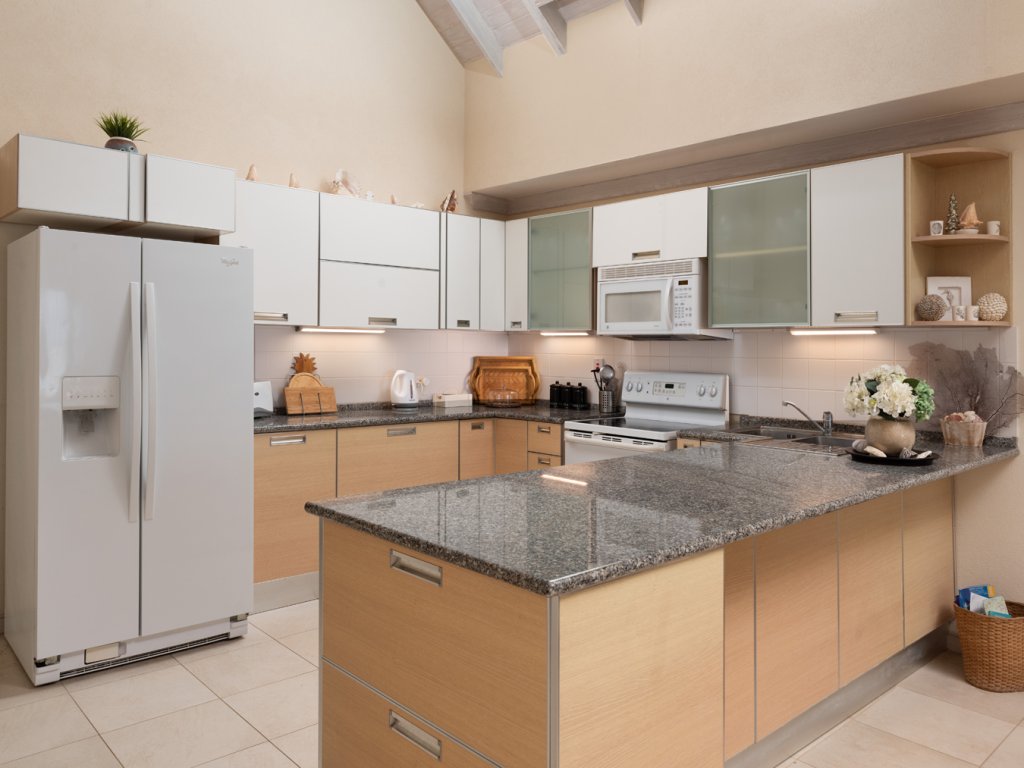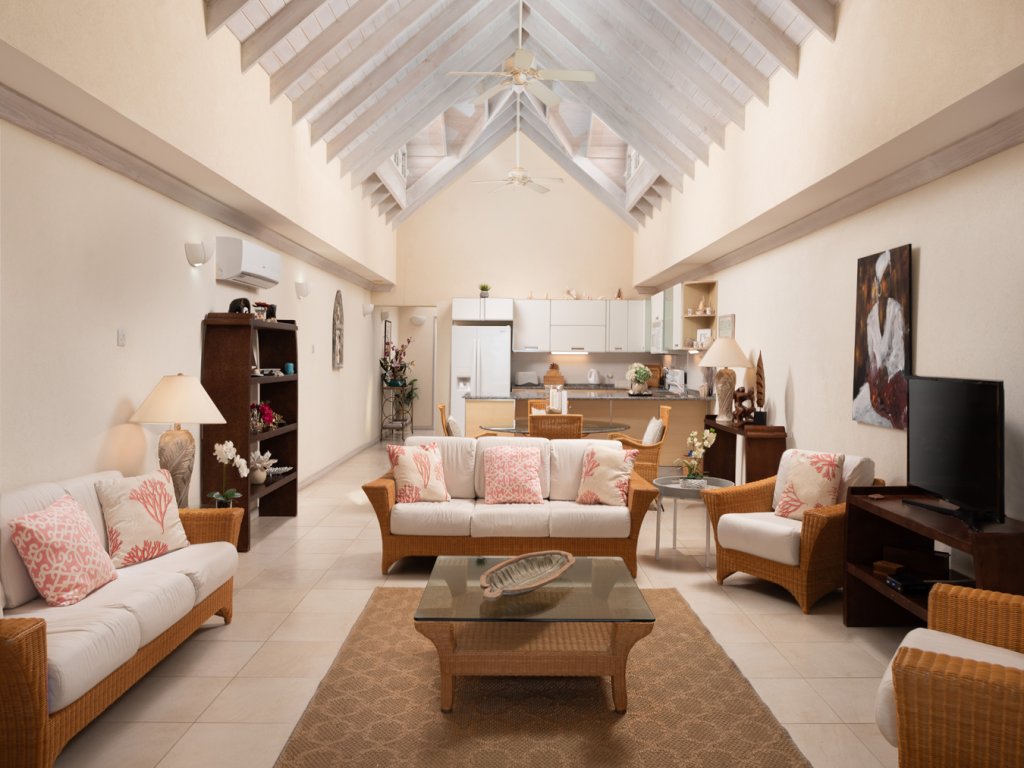 It's a really spacious two-bedroom, two-bathroom place, spread over two floors. The top floor? Wow. It has these super high, pickled-pine ceilings that make the whole place feel so open and airy. You can be in the kitchen, look right through the lounge, and out to your private patio overlooking the sparkling Caribbean Sea. Talk about a view!