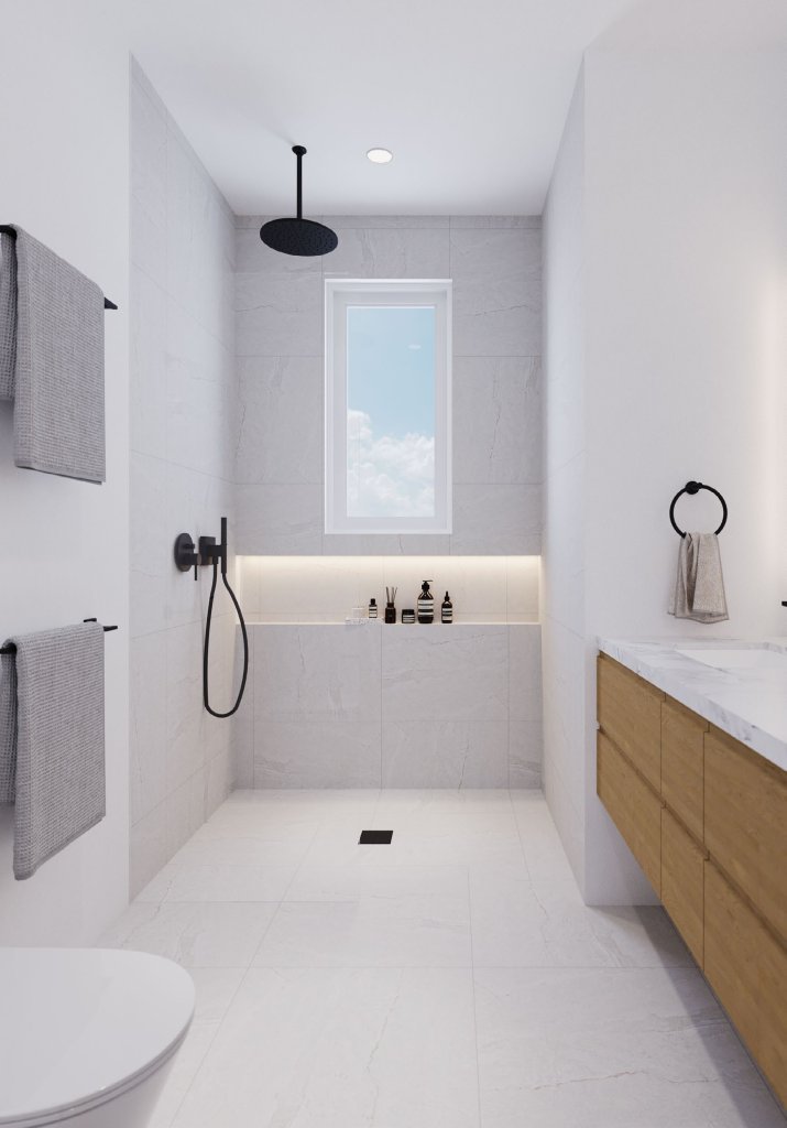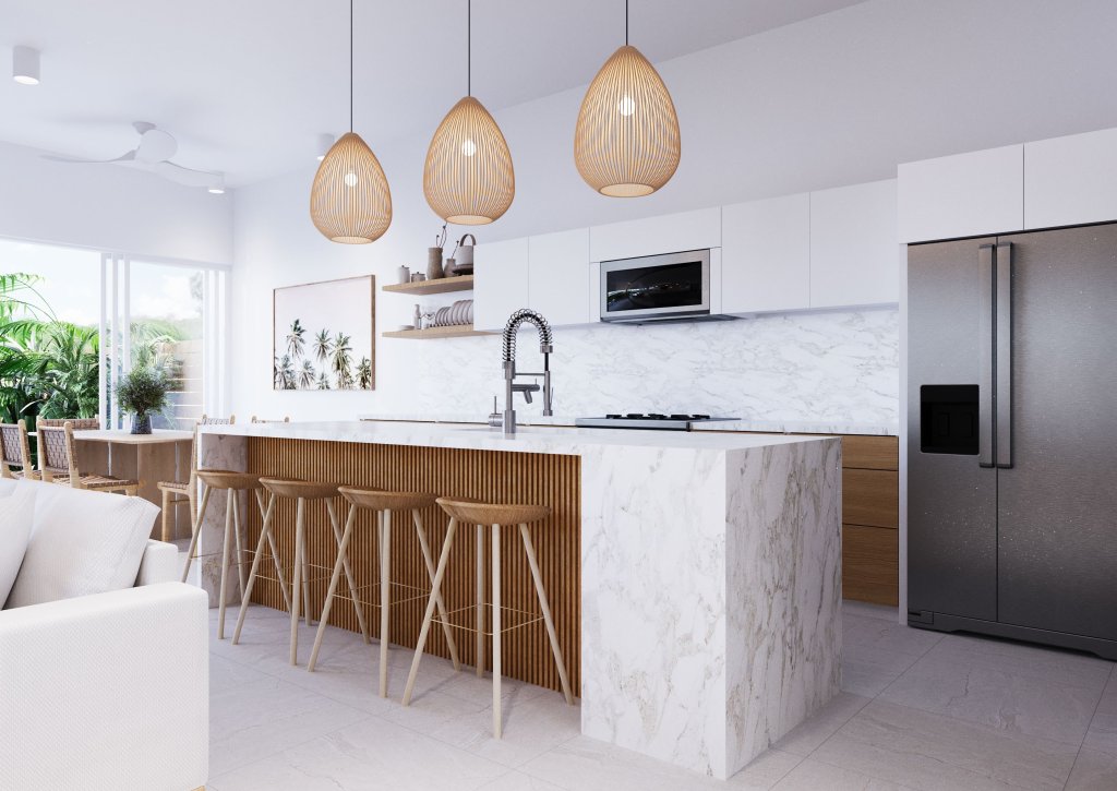 As you enter the 4-bedroom Palma Townvilla, you’ll immediately notice its thoughtful design and open-plan layout. The kitchen, the heart of the home, features premium Calacatta countertops, an oversized waterfall island, and sleek cabinetry that offers both style and functionality. Sliding glass doors seamlessly connect the indoor living areas to the outdoors, allowing natural light to fill the space and creating a warm, inviting ambiance perfect for entertaining or relaxing.