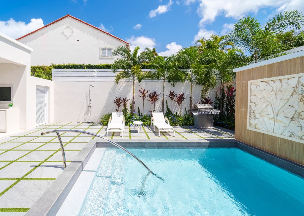Designed for the quintessential island lifestyle, the villa features an additional 1,160 square feet of expansive patio and terrace space. The outdoor area is a true entertainer’s dream, boasting a built-in bar, a dedicated dining area for eight, and a private pool surrounded by custom tiling and lush tropical gardens. Upon arrival, you are greeted by a front garden flourishing with aloe, mango, and avocado trees, while the rear oasis is framed by mature palms and vibrant vines. Every window is fitted with insect screens, allowing the refreshing Caribbean cross-breezes to flow throughout the home, while integrated security cameras offer total peace of mind.