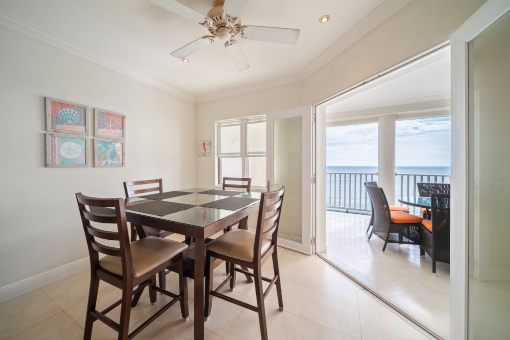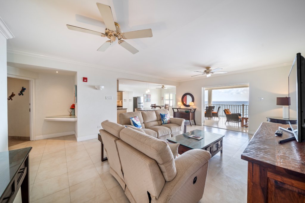 Step into the spacious living and dining area, where sliding glass doors open up to a large, covered patio that invites you to relax while enjoying uninterrupted, panoramic views of the pristine Caribbean Sea. Whether you’re hosting guests or simply unwinding, this outdoor space offers the perfect setting to soak in the breathtaking azure waters and gentle island breezes.