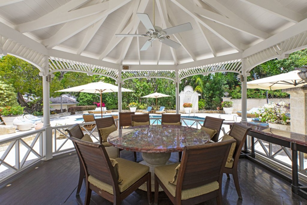 A poolside gazebo provides a serene spot for dining or lounging, while a short pathway leads to a dining pavilion that opens onto a terrace surrounded by mature gardens and a tranquil koi pond. This outdoor space is ideal for enjoying the tropical climate and lush surroundings.
