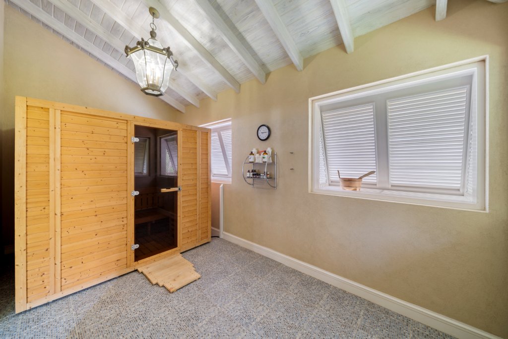 A dedicated fitness room, sauna, and expansive walk-in closets