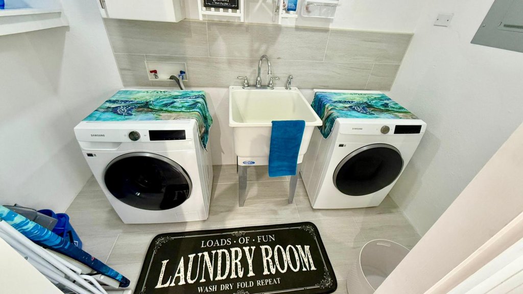 Modern appliances, including a washer, dryer, and dishwasher