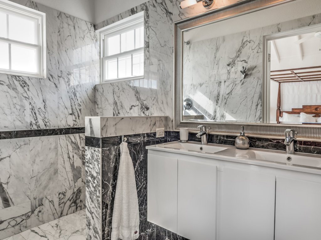 On the basement level, a self-contained one-bedroom, one-bathroom apartment opens to a deck with a private staircase down to the beach.