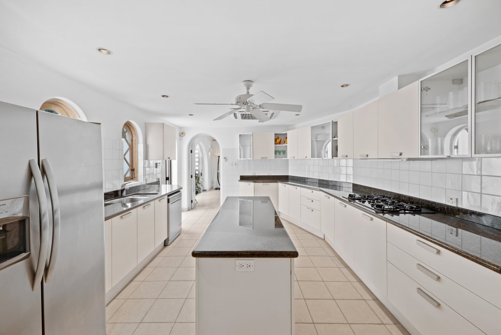 The kitchen features an ‘Island Unit’ and granite countertops and is fully equipped, outfitted with Italian kitchen units and a full range of appliances, including a dual-fuel cooker. A wet bar and bottle-fridge can be found on the terrace which leads onto the sun deck where there is a gas barbecue with rotisserie for informal dining, and a negative-edge swimming pool and spa pool. A private stairway leads from the pool deck to an unspoilt beach below. The Beach Hut is fully wired for internal and external alarm systems, features electric gates, and has a double car garage with electric doors. The landscaped grounds and planters are all equipped with an auto irrigation system.
