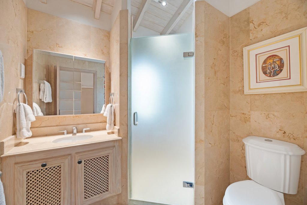 In the north wing you will find a powder room with marble walls and floor, plus two spacious bedroom suites, which open directly out to the swimming pool. Four additional bedroom suites are located on the upper level, including the elegantly furnished master bedroom suite, featuring a sitting area, walk-in closet and luxurious marble bathroom with shower and spa tub. The master suite also leads onto a balcony enjoying views of the white sandy beach below.