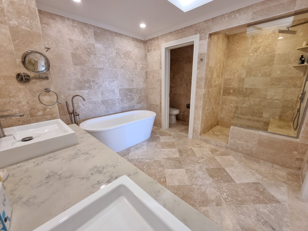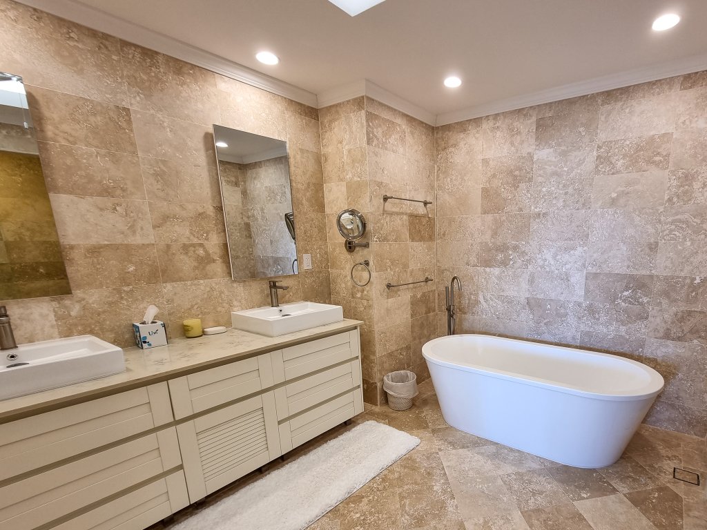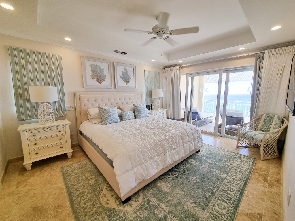 The grand primary bedroom is a sanctuary of luxury, where you can wake up each morning to mesmerizing ocean views. The two secondary bedrooms provide a tranquil retreat, overlooking beautifully landscaped tropical greens and sharing a covered balcony. Comfort is paramount, with air conditioning and ceiling fans in all bedrooms ensuring a pleasant atmosphere year-round.
