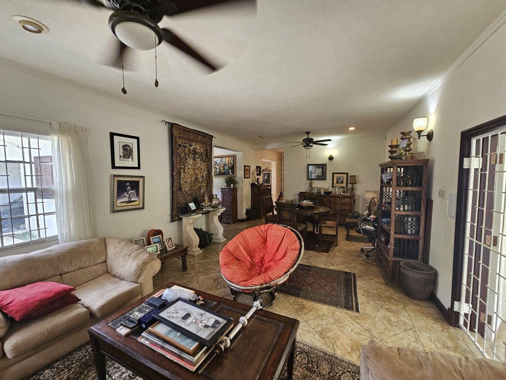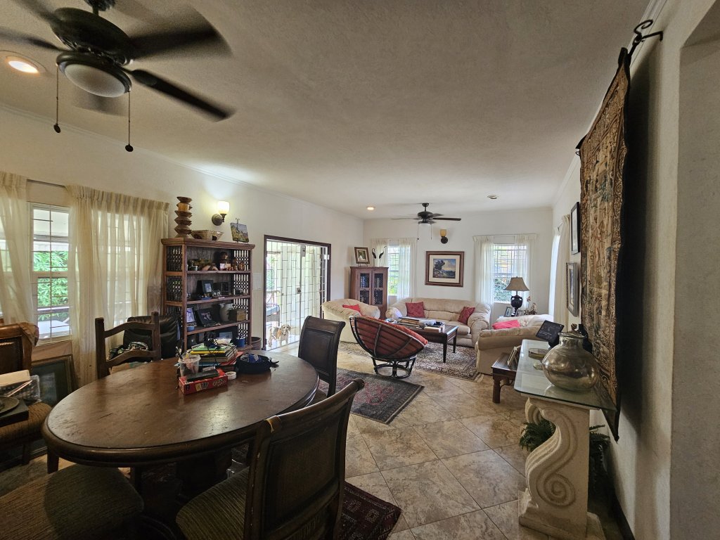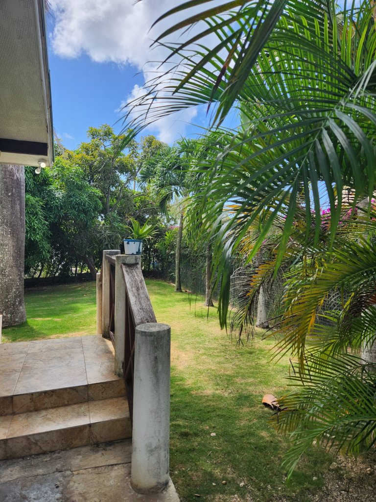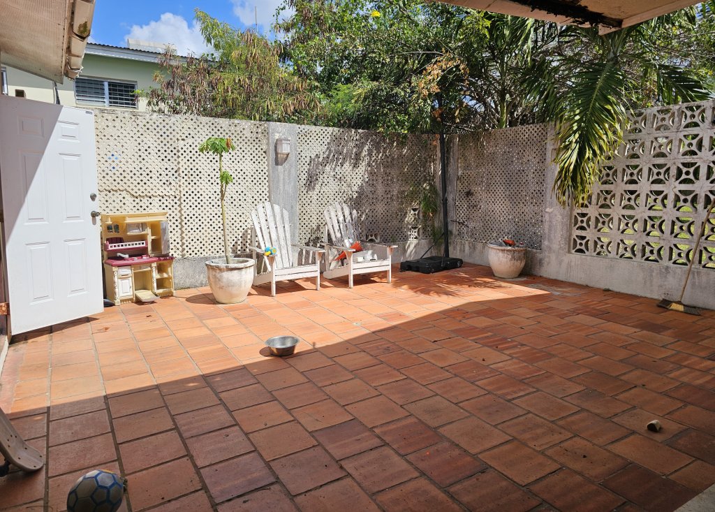 On the main level, you'll also find a cozy TV room, perfect for movie nights, as well as a versatile study/den that can be transformed into a home office or playroom. A convenient powder room is located nearby, making it easy for guests to freshen up. The living area opens out to a covered patio that invites you to relax and unwind with your morning coffee. Beyond the patio lies an open-air red clay tiled courtyard, a charming spot for alfresco dining or simply soaking up the Caribbean sun. Adjacent to the courtyard is a large laundry room, ensuring practicality and ease in your daily routines.