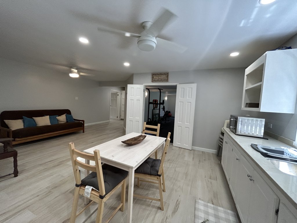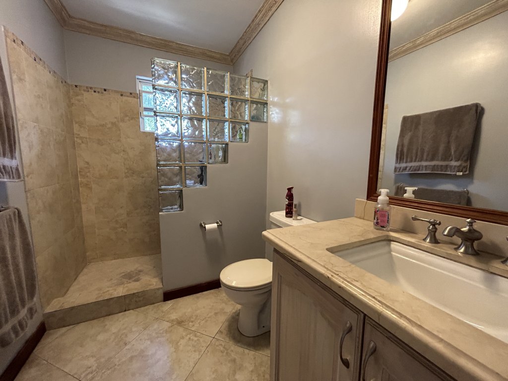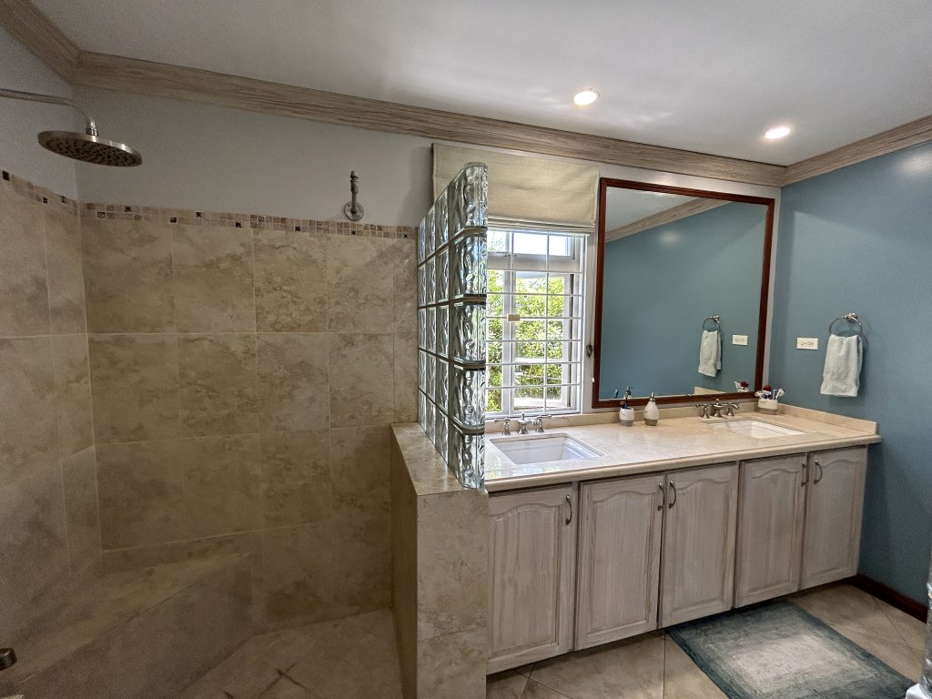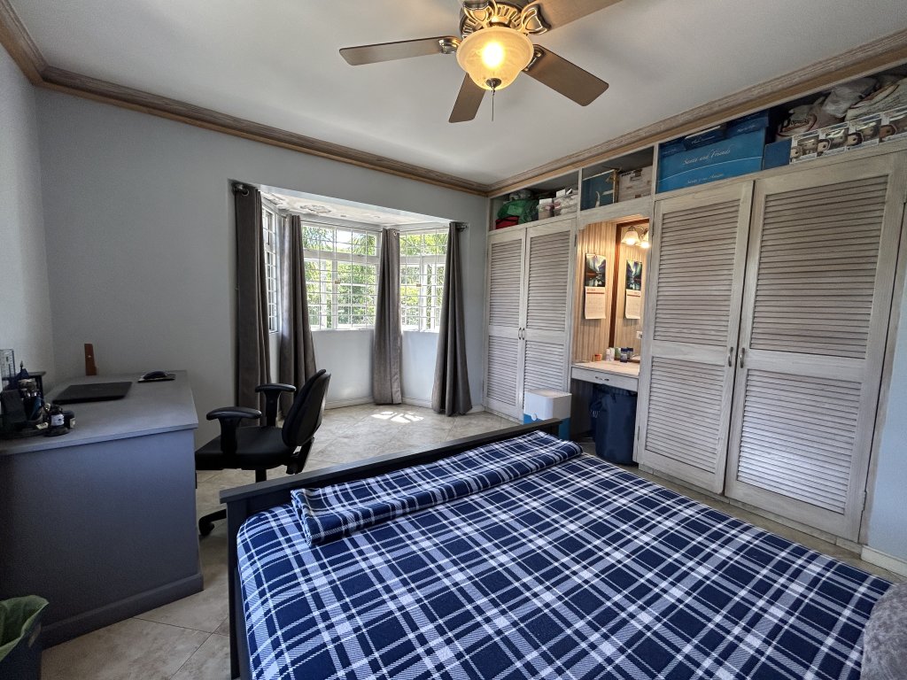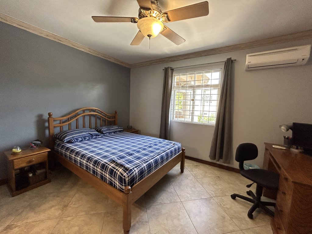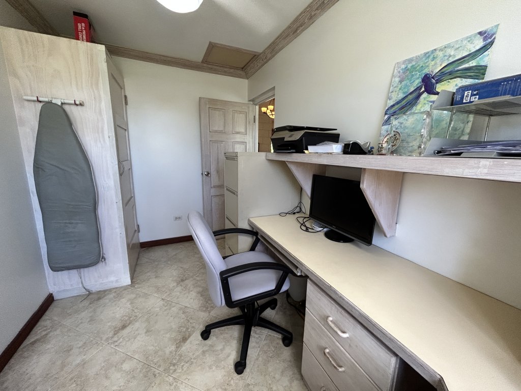 The upper level features a spacious three-bedroom, two-and-a-half-bathroom home designed for comfortable everyday living and entertaining. A round, covered patio leads into an open-plan living, dining, and kitchen area with high ceilings that enhance the sense of space and light. The kitchen is well-appointed with granite countertops and ample cupboard storage. All bedrooms are outfitted with air-conditioning and ceiling fans, with the primary bedroom being exceptionally sized and benefiting from a walk-in closet and private en-suite bathroom. Bedrooms two and three include built-in storage and share a second bathroom. This level is completed by a guest powder room, a spacious home office, and a dedicated laundry area.