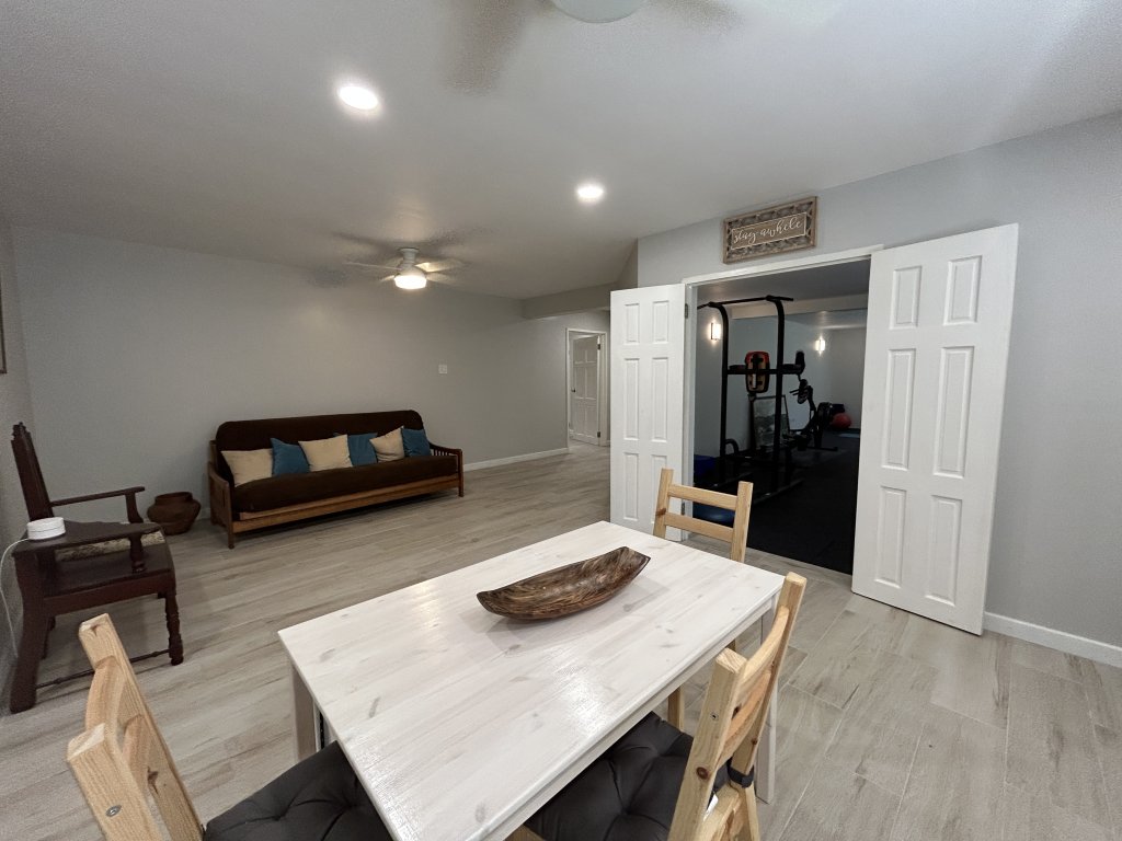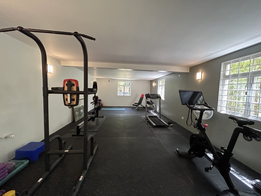 The lower level comprises a two-bedroom, one-bathroom self-contained flat, ideal for extended family, guests, or rental income. Both bedrooms are equipped with air-conditioning and ceiling fans, and the space also includes a large gym area. Wrought iron features are present throughout the lower level, adding to security and durability.